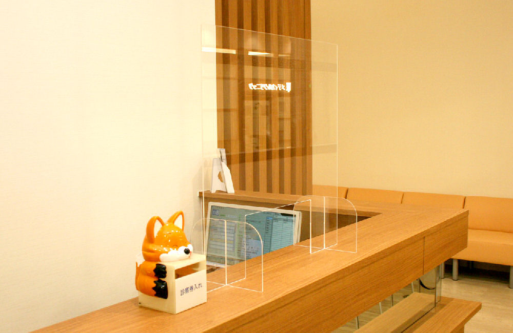 また受付では、会計時での感染を防ぐため遮蔽板を設置するとともに、ソーシャルディスタンス確保のため患者様の席は間隔を取って頂いています。